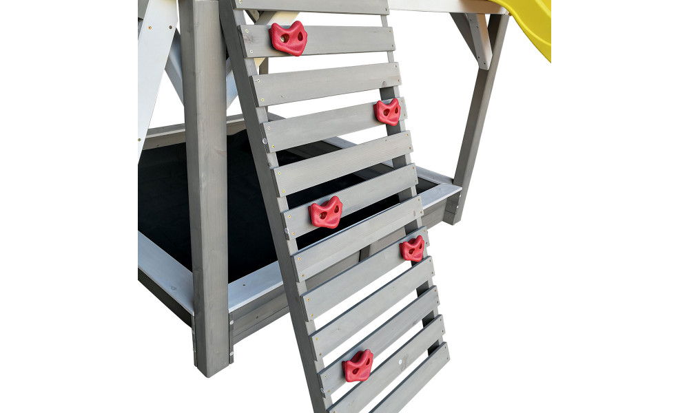 Горка с двойной волной снабжена боковыми бортиками, обеспечивающими безопасность малышей. Скалодром с 5-ю камнями-зацепами поможет развить ловкость.