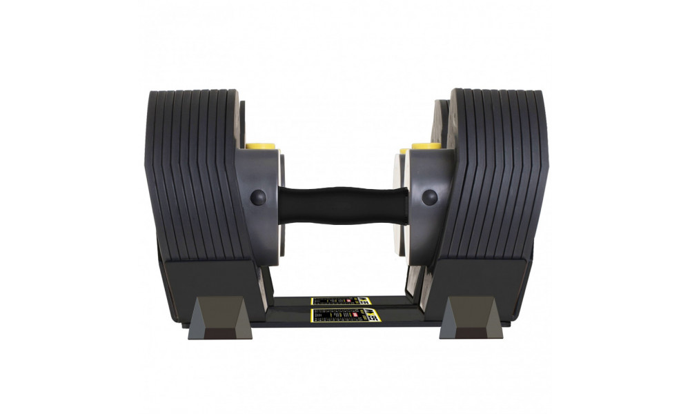 С MX85 вы можете тренироваться с десятью различными весами от 5,6 до 38,6 кг. Выберите вес мгновенно с помощью специального диска для выбора веса. Нажмите кнопку, диск поднимется, поверните его в нужное положение, нажмите снова — и готово! Вы можете поднять гантель, включая выбранный вес, из подставки и сразу начать тренировку.