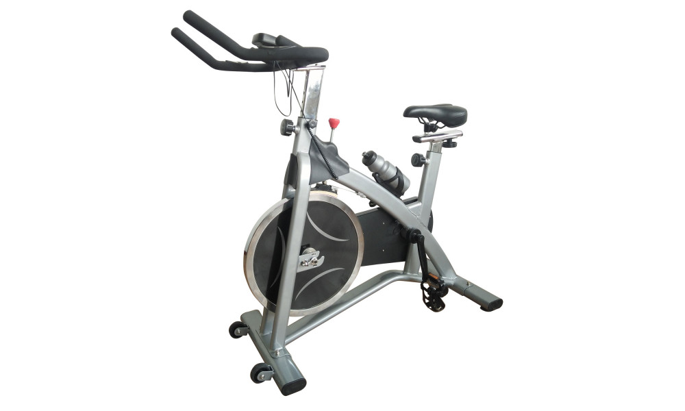Вертикальный механический спин-байк с ременным типом привода и колодочной системой нагружения. Изменение нагрузки с помощью рукоятки на корпусе тренажера. Анатомическое сидение регулируется в вертикальной и горизонтальной плоскости, и позволяют подобрать удобную посадку для тренировки. Встроенные датчики на руле позволяют контролировать пульс во время тренировки.